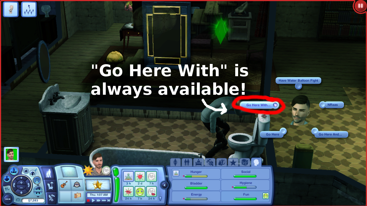 One thing that I was really thankful for in The Sims 4 was the ability to control non-active sims with the "Go Here Together" interaction, as well as being able to direct them to sit and use objects with their group. We have the "Go Here With" and "Go Here With Group" interactions in The Sims 3, but they require the click point to be a certain distance from the sim and they have to have a relationship score of at least 20. When trying to interact with non-active sims, I find that they like to wander around and go places I don't want them to and I'd like to have a little more control over them regardless of the relationship score. I tried to look for a mod to make these more accessible, but I never found one.