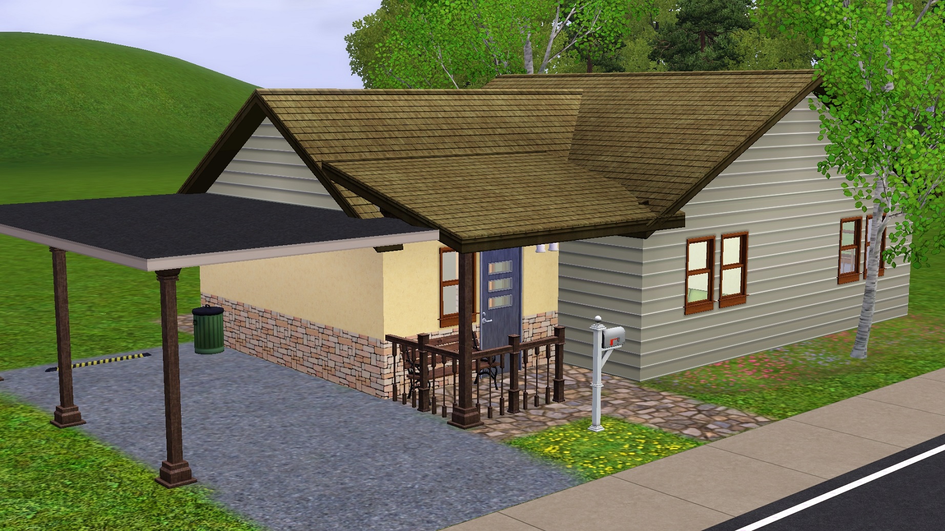 Hello all! This is my newest starter home upload. It is a simple, one-story, ranch-style house. It has two bedrooms, one bathroom, and a combination eat-in kitchen and living space. There's a patio out back for adding a grill or hobby space, plus open land for gardening. The bedrooms are on the larger side, but have been sparsely furnished in keeping with the starter home style. Either could easily be converted into hobby space or a nursery.