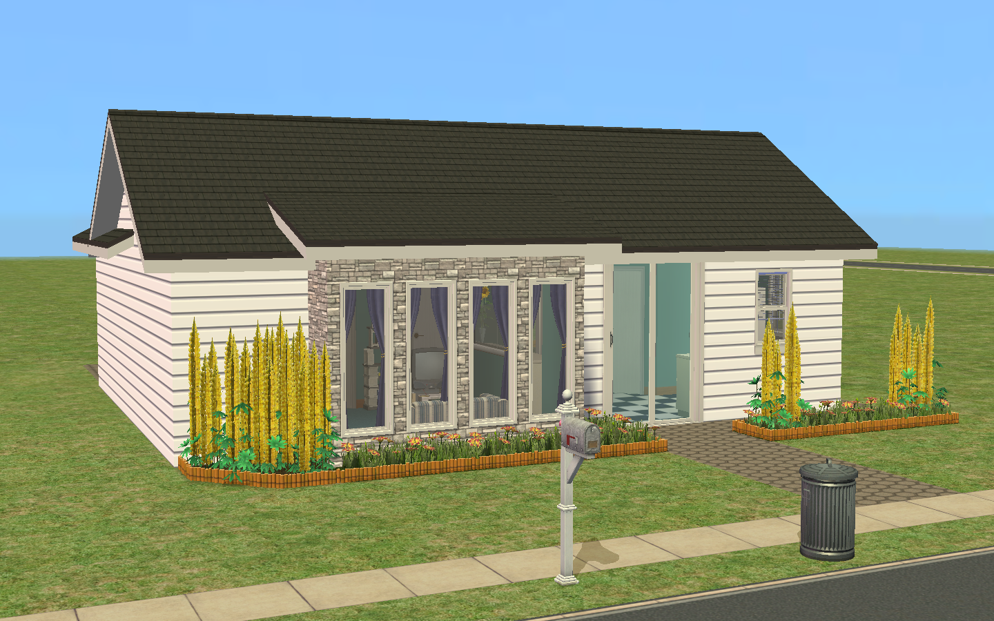 A modern starter home furnished for 4 sims (maybe 2 parents and 2 twins) with quite an open floor plan, and a patio and small pond out the back. It's kind of similar to newer homes by the British coast that are built out of stone.