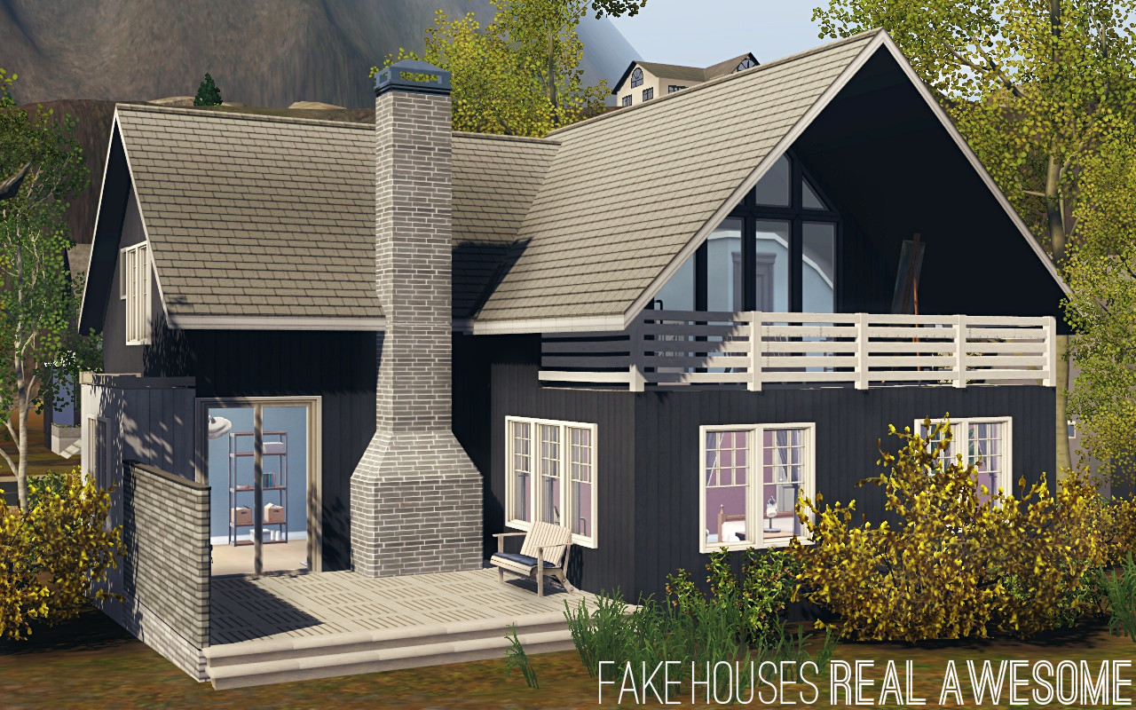 This contemporary home features open-plan living areas, an oversized master bedroom, and a covered deck on the second level overlooking the backyard. The second floor features sloped ceilings and contains two bedrooms and two full bathrooms. The space under the sloped ceilings is very usable; Sims can use beds, chairs, toys, etc. placed there without issue.