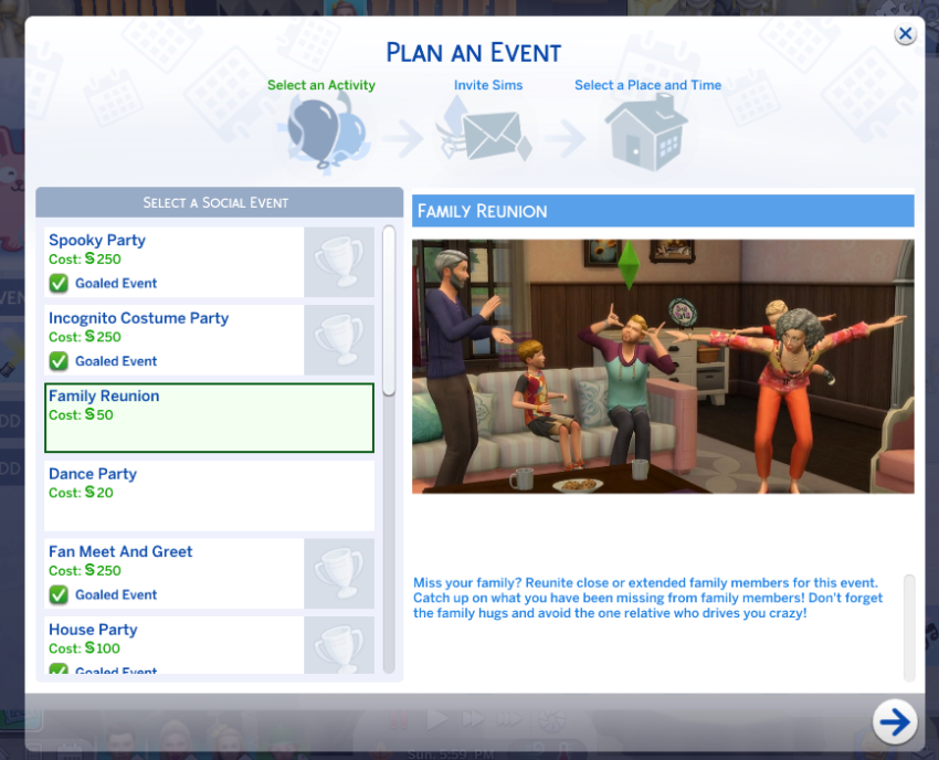 Family Reunion event.Text reads: "Miss your family? Reunite close of extended family members for this event. Catch up on what you have been missing from family members! Don't forget the family hugs and avoid the one relative who drives you crazy". The event is not a goaled event, and I have only assigned a host along with guests. You may invite bartenders, chefs, ect but you will need to select them in the game and click "Hire staff".