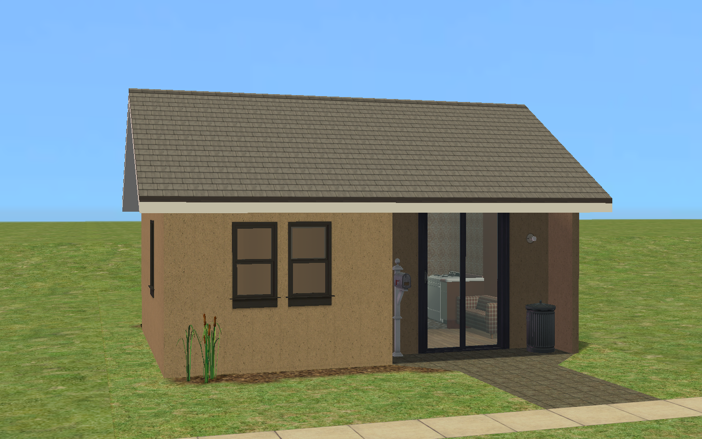 A small budget starter, a sort of "concrete box", furnished for two Sims with only the basics.