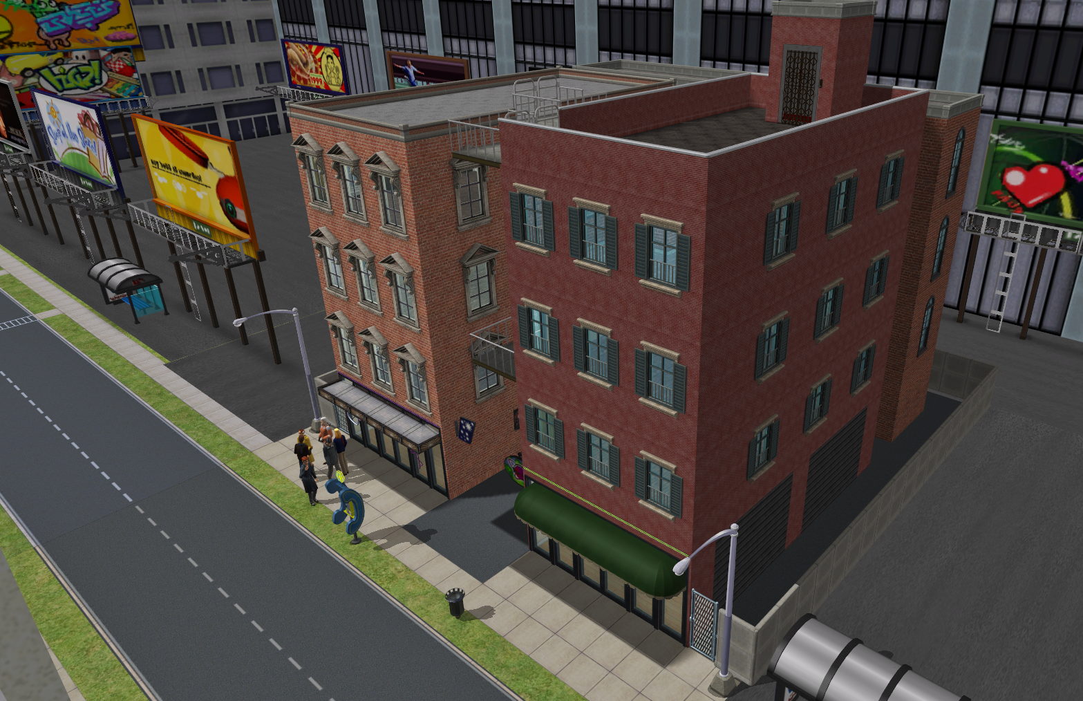 Although it is a community lot, I left it unfurnished besides lighting, exterior decor, and bits & bobs like pipes/vents. Because it has a lot of potential uses, I wanted to leave that open to your choosing. It can be an apartment lot with ground floor shopping using MogHughson's mod, or it can be apartments on their own. Possibly even be some sort of unconventional mansion-type house for a sim? It can also simply be a shopping community lot. Maybe even the shops have a secret speakeasy bar with gambling in the back building, or some party rooms with bubble blowers & DJs on the upper floors? Plus, it can work as hood deco if you plop down a few copies, then you got yourself a shopping district! I figured I would leave it unfurnished to make it more repeatedly functional.