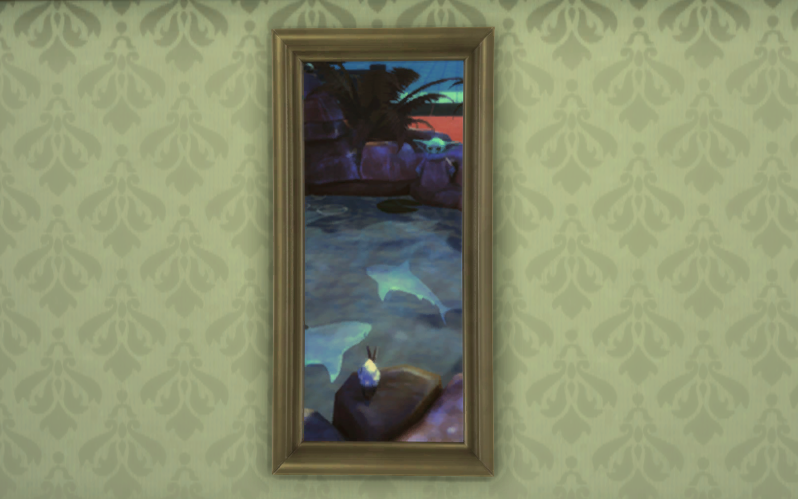 You can find this masterpiece in the paintings & posters section of the build and buy mode catalogue or by searching the name "Baby Yoda adventures"