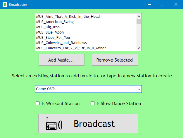 - When Broadcaster opens, click "Add Music..." and a dialog box will appear, allowing you to select any number of MP3 files you want to add to the game.