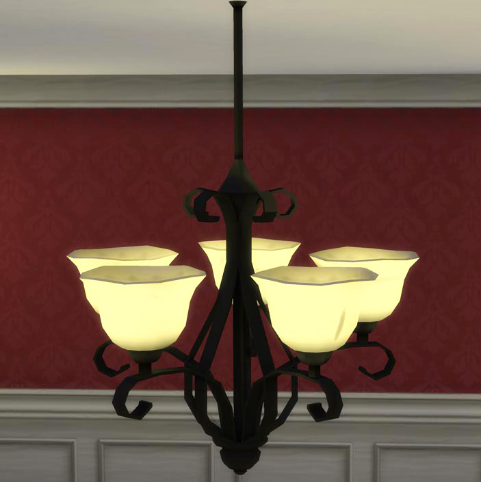 This chandelier comes in 3 unique colors: Wrought Iron, Bronze, and Silver/Grey. There are also 2 bonus Silver textures which are sourced from the original colors from blake_boy. Beyond colors, this chandelier is Base Game compatible, and I edited the Model data in Sims 4 Studio to allow for no camera fade as the fading made this chandelier hard to appreciate and adore. This chandelier was cloned from the Base Game Ring o Light chandelier.