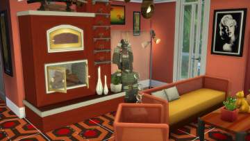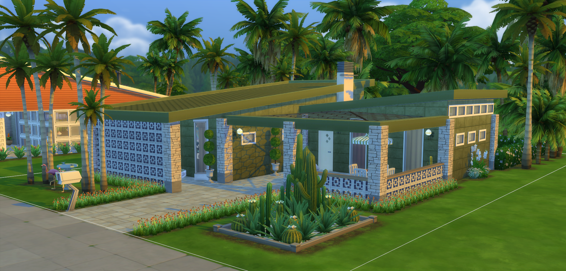 Hello everyone! I'm back with another home from my Atomic Acres neighorhood. I call this one The Mulholland Drive because I thought of California while building it. It's a three bedroom, one bathroom home with a livingroom done in Hollywood and Japanese themes. The kitchen has an eat-in area, and the bathroom has a laundry room adjacent to it. The smaller of the three bedrooms can be for children if needed. Feel free to change things to suit your needs. The pool area is very secluded among the palms and shrubbery, and there's a sitting area under the front awning with a place to grill. I used the new Eco-Lifestyle roofing for this build as well. I hope you all like it! I've included an additional photo to show where I built the lot, but you can place it wherever you please. My Sim featured in the pics does not come with the home.