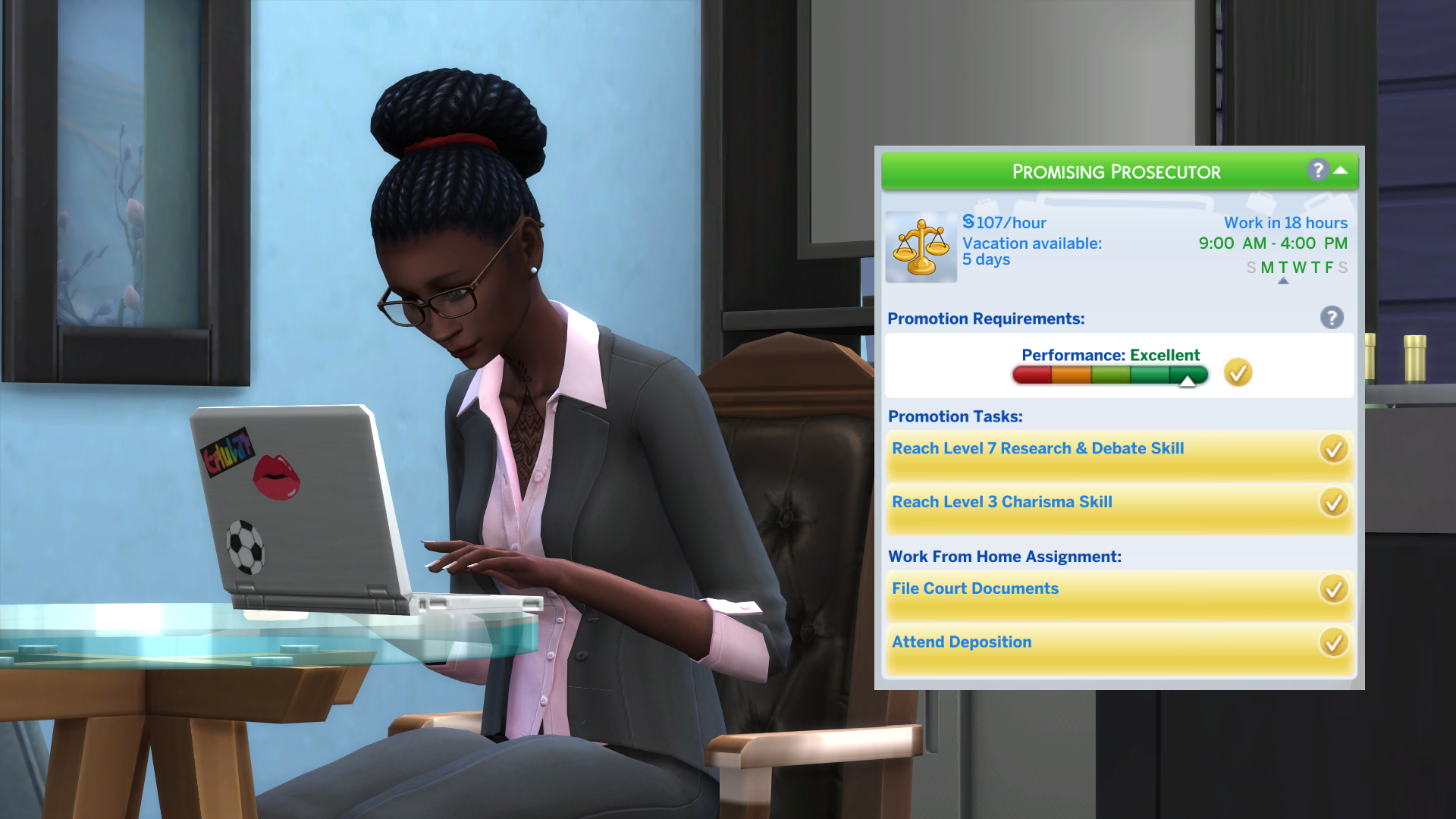 This is a temporary fix for Law career sims working from home. At rank 5 (Budding Barrister) and above, "File Court Documents" is a possible assignment, but the computer interaction is missing. This mod removes the rank limit for the interaction.