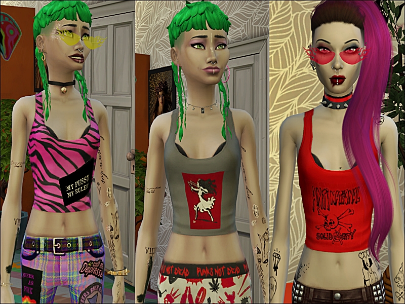 this is a base game recolor of the short bellytop, where the bra is visible a little. it comes in 7 swatches, dead kennedys, nofx and some feminist, anti-establishment like swatches. and can be found in the everyday and hot weather categories. hope you enjoy, let me know. (;