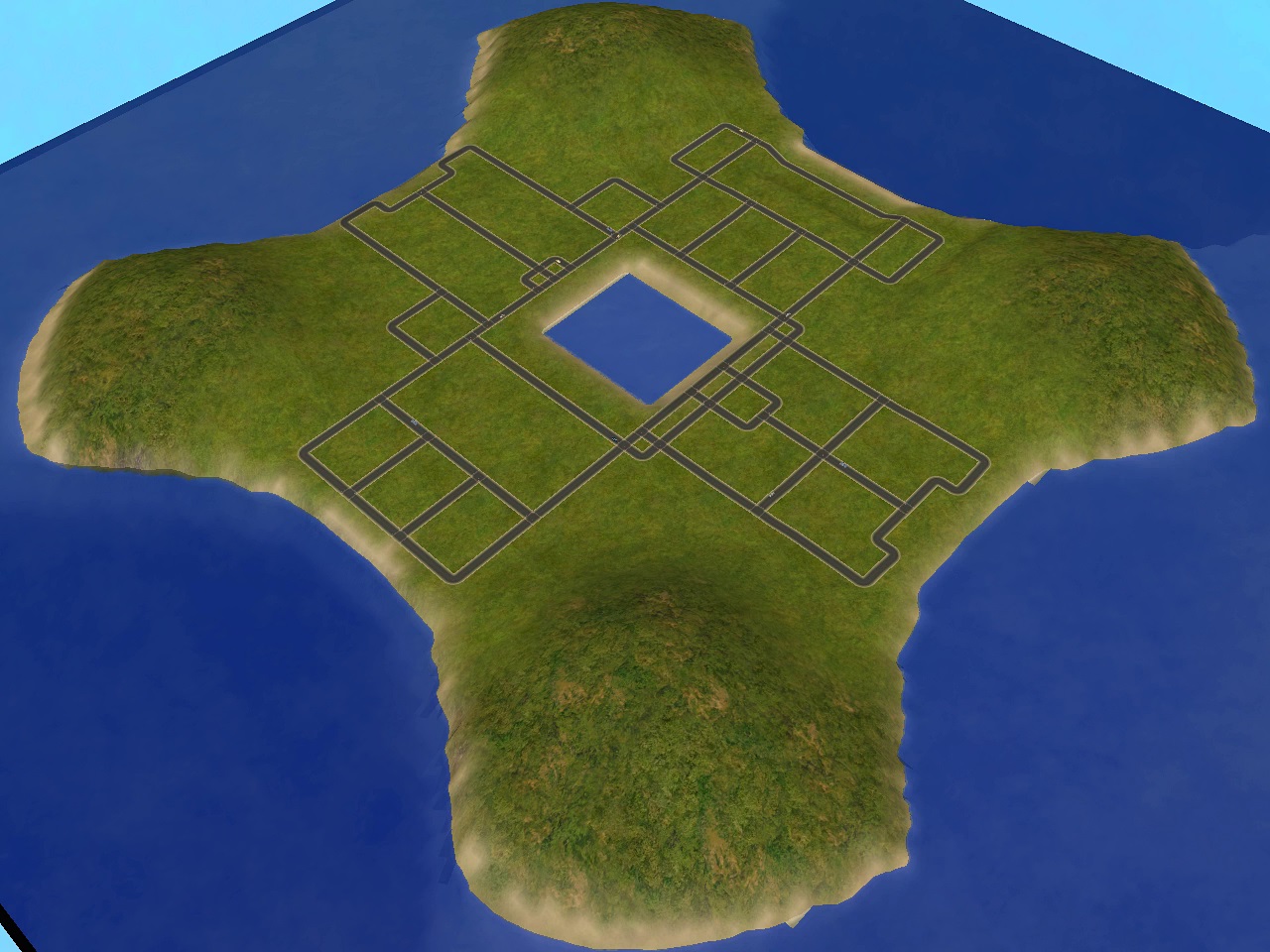 These are two islands with hills at their four ends, it has roads with multiple intersections, the possibility of housing plots of various sizes from lots of 1x1 to the largest size available in the game and the creation of beach plots on its shores, In the version with a pond, beach plots can be created.