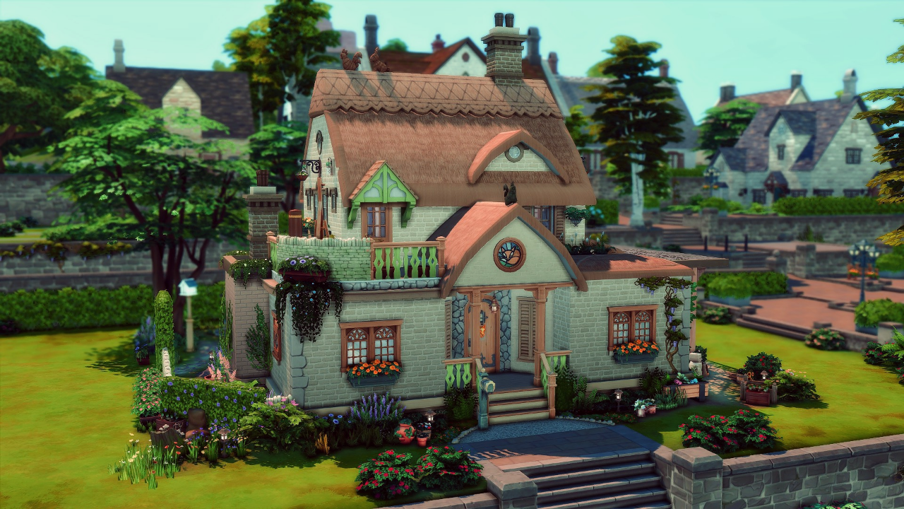 "This cozy home sits in the heart of Finchwick and is steps away from the small village's community hub. Though it can get a bit loud on fair days, there's no better place for a Sim who wants to be a part of it all."
