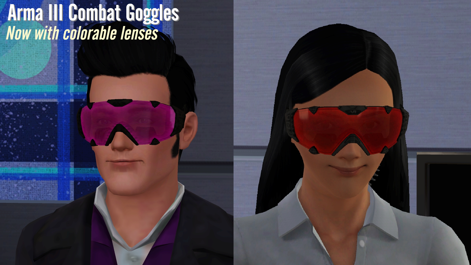 Arma III's combat goggles painstakingly ported into The Sims 3's engine and modified to fit as needed. Comes in two versions, one which is the updated version with better lenses, and the older version which is slightly smaller and uses the reflective sunglasses shader for the lenses.