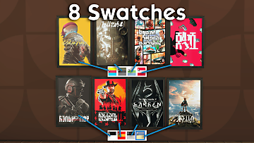 All but one of these are pretty much just simple text swaps, with 8 swatches, for the following games: