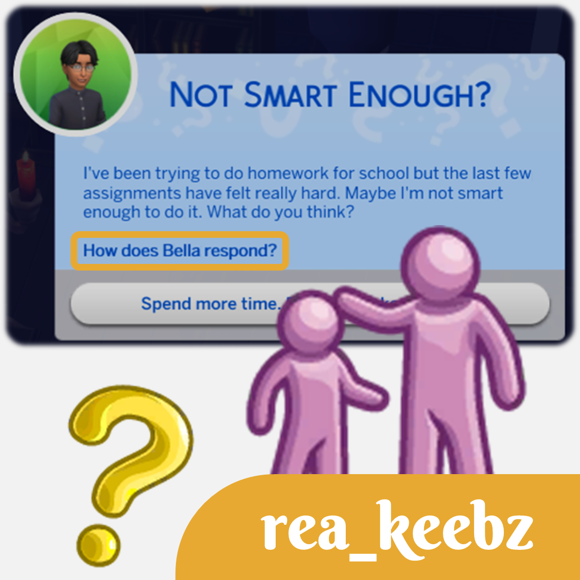 An icon containing an adult caring for a child, a question mark and a screenshot from the game. The screenshot is a pop-up of Alexander Goth asking for advice. At the end of the advice question, "How does Bella respond?" is emphasised with a rectangle around it. The Icon has the username "rea_keebz"