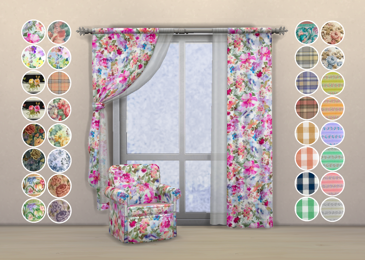 This is a basegame recolor and contains left and right versions of straight and tied curtains. Matching sofa and armchair can be found here: Auntie style sofa and armchair.