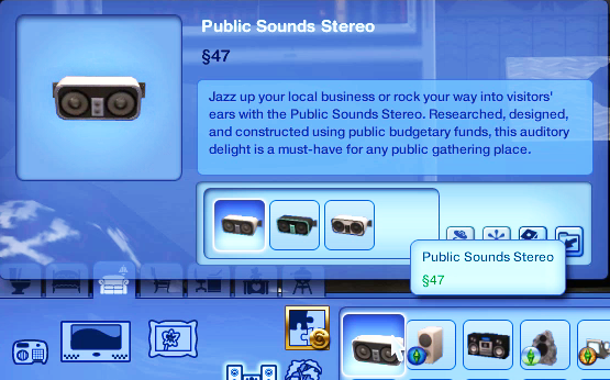 This mod overrides the original base game wall speaker 'Public Sounds Stereo' by recategorizing it under several more easy to find sections, like in the Electronics/Audio one and making it available for both residential and community lots.