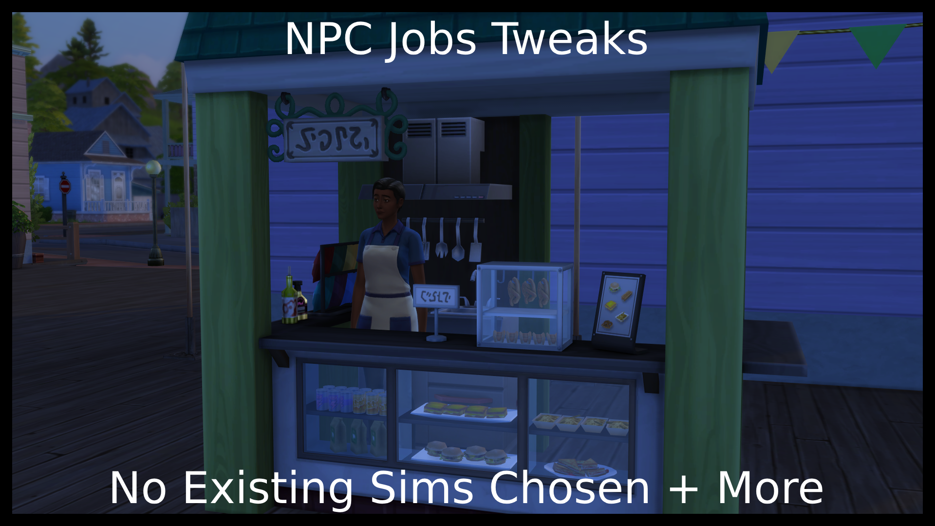 Within the game, certain NPC jobs select a Sim under certain criteria to make sure that special characters cannot be selected. What was annoying with this, however, was how it would make Sims I created or pre-made Sims into workers for bartenders and vendors, just to give a few examples. This mod changes the filters for certain NPC jobs to mostly avoid pre-existing Sims to be selected. In addition, some other tweaks are included to increase or decrease the age ranges allowed to add more realism or variety. For now, the bartender, vendor, gym trainer, librarian, barista, and yoga instructor have been altered. While this mod does affect some packs, those packs are not required.