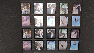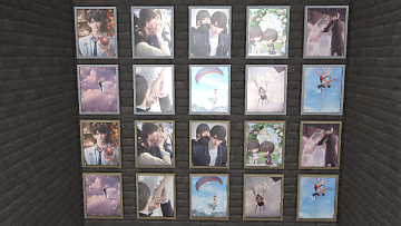 : jk. but i do love that one of the dialogue Caleb often said is he wants us to take more picture so we could put it up on the wall. So here it is me hanging pictures of him and us on the (sims) wall. Mainly the graduation one because it lives rent-free in my mind, but also another nine (mainly from the wedding and the beach banner) for good luck.