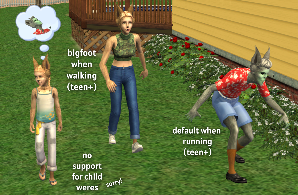 Your werewolves will still do the clawing-snarling idle/overlay while walking, which pairs nicely with the Bigfoot walk. They'll also still move slightly slower than normal sims, since I didn’t try to mess with the default animation speed to avoid possible issues.