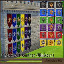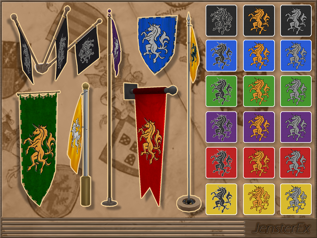 So to give medieval sims game-play just a bit more immersive realism here are 5 flags, a banner and shield in 6 background colours and 3 foreground colours to decorate your castles, throne rooms, town squares, towers and barracks.