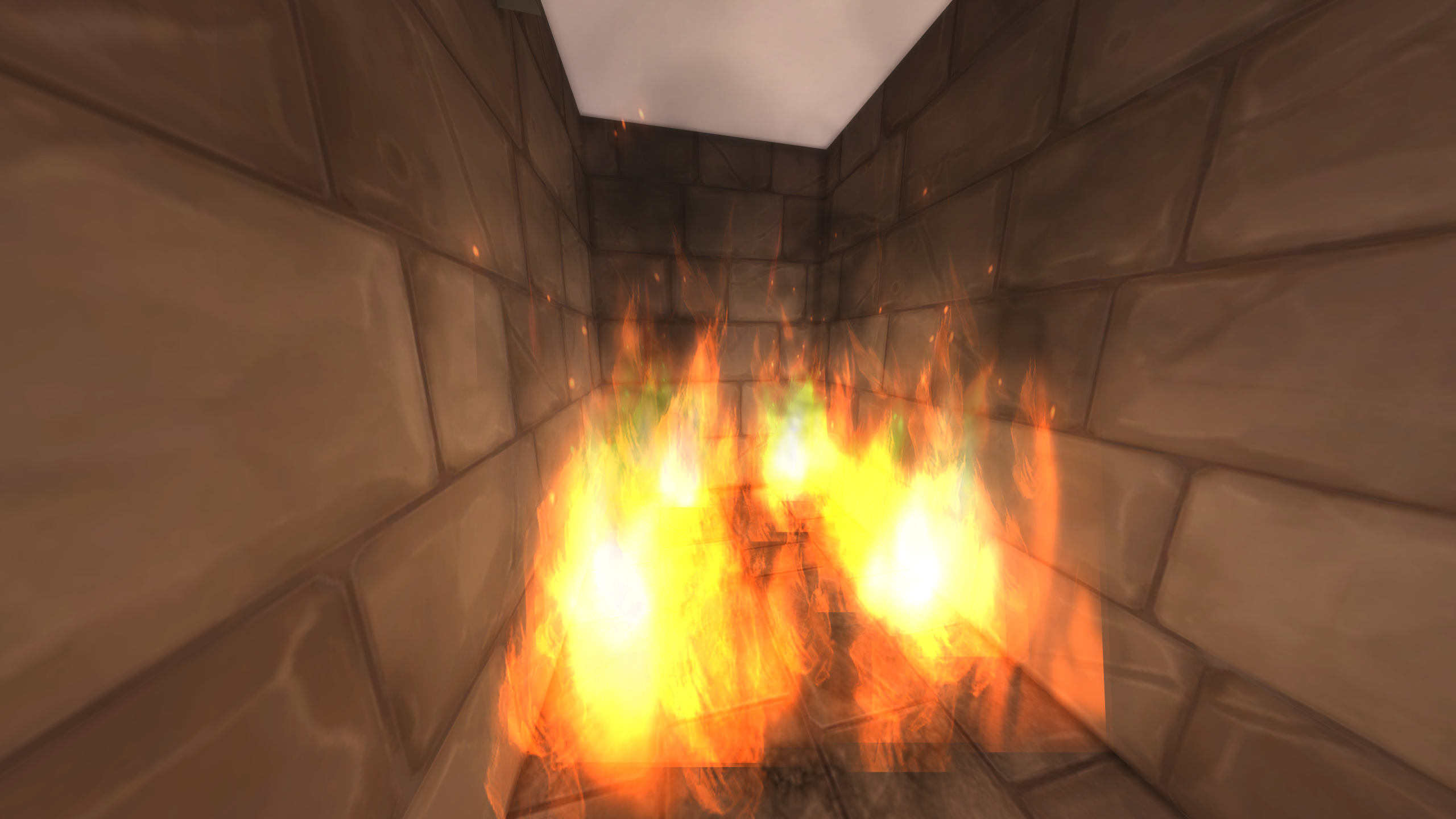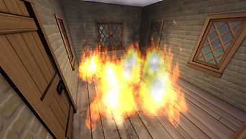 A Ingame Screenshot of a Interior in flames, the flames cast light on the walls, floor and ceiling, the light will even go through windows.