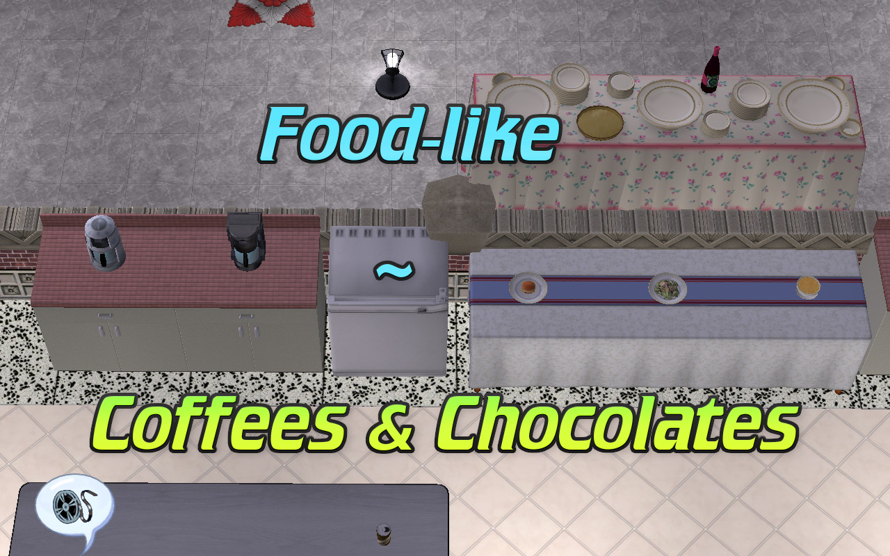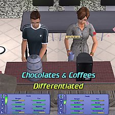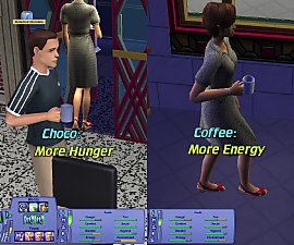Coffees and hot chocolates are also diffferent in the amount of motives they fulfill: Coffees restore more Energy, but also much less fulfilling; Chocolates can fill up to 1/4 the Hunger bar a mug, but also more impacting on Bladder.