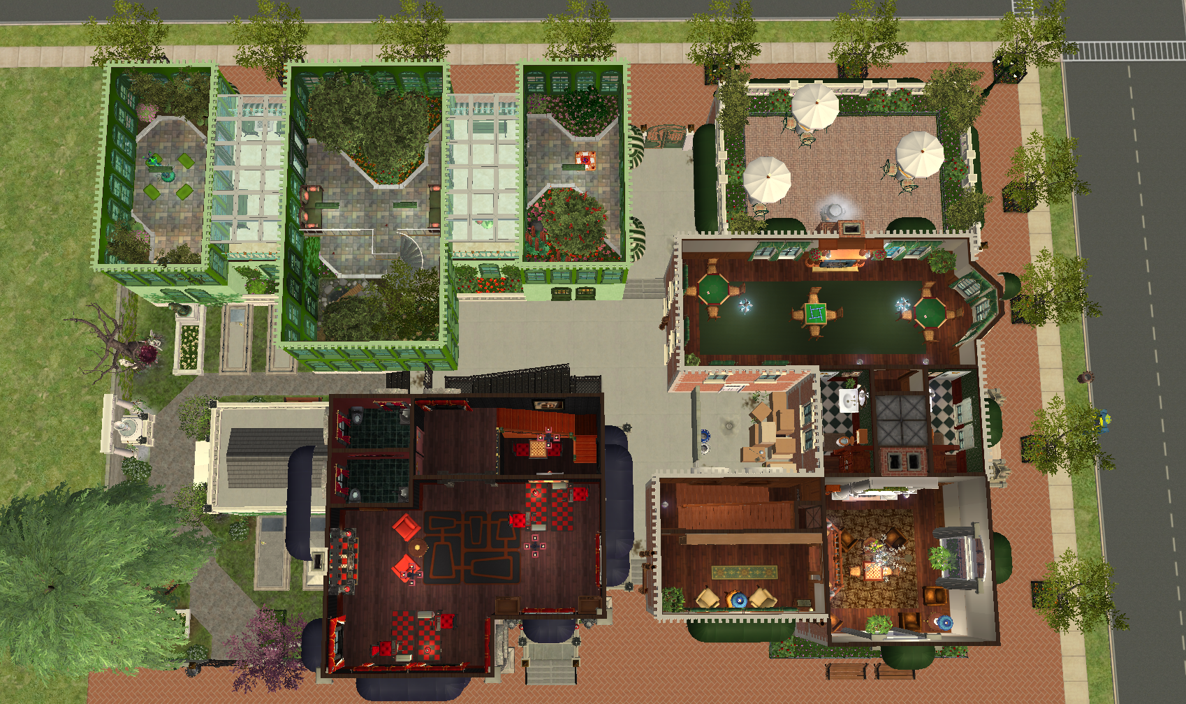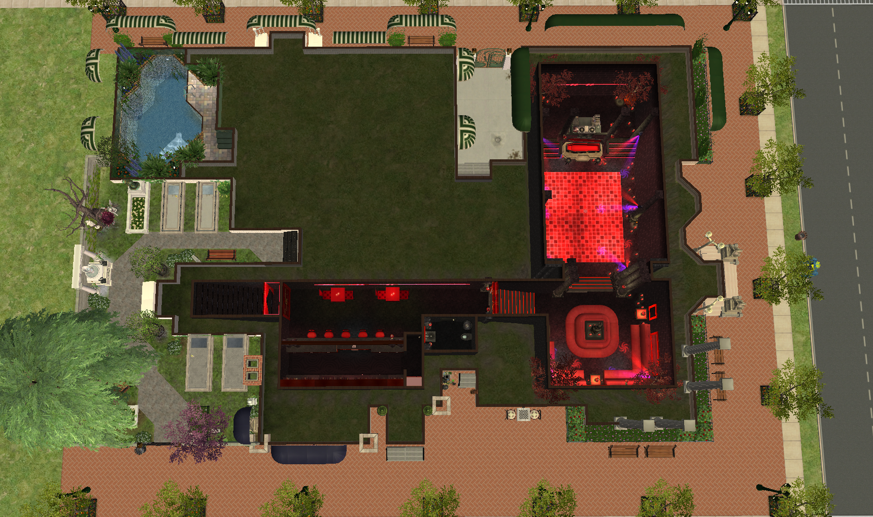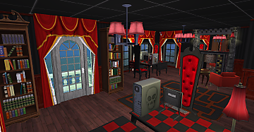 This lot provides three different social scenes specifically tailored for PlantSims, Witches/Warlocks, and Vampires. PlantSims get the Glass Garden, a luxurious urban greenhouse with plenty of social areas and a plunge pool for ‘watering’ themselves when they need to be refreshed, Witches have the Arcanum Club, a more traditional old-money social club with a restaurant, game rooms, and studies and libraries for more arcane research in the upper levels, and Vampires have… a goth coffee shop? No! In fact Vampires pretend to have a goth coffee shop, while instead actually spending their nights disappearing through the door of a crypt in the nearby graveyard, which leads to Flatline, an ebony and crimson-hued nightclub buried underground beneath this city block!