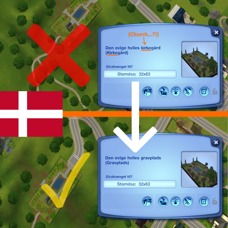 De danske og svenske oversætterteams af Sims 3 tog ikke hintet, og derfor oversatte grundtyper, grundnavn, ønsker, og mere, til "Kirkegård", som om de var den type gravplads der specifikt er forbundne med kristne kirker.