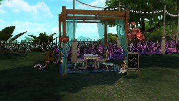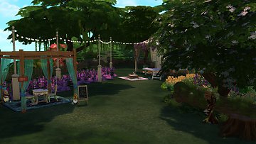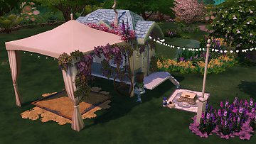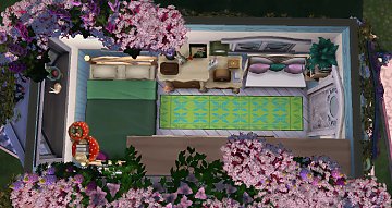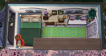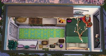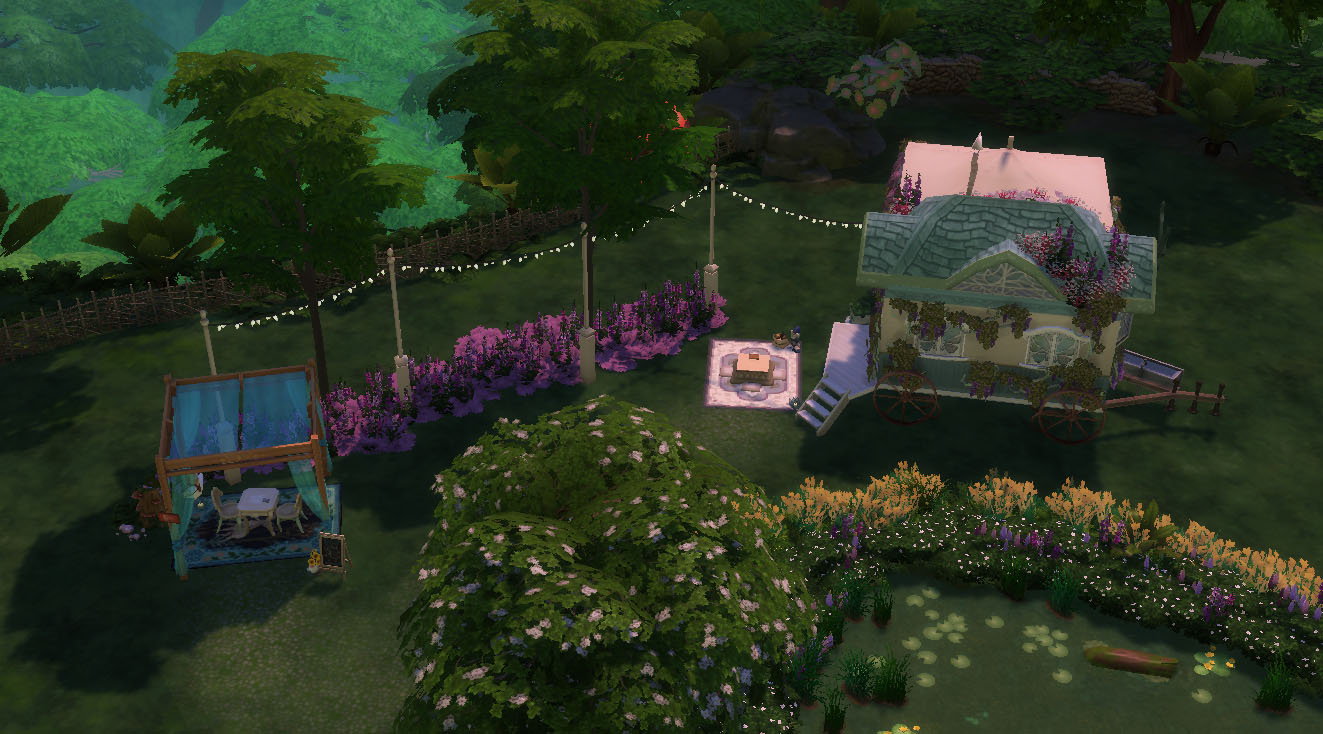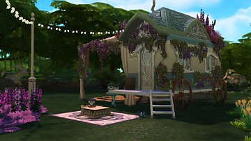 I staterd working on this lot a while ago, but only finished it today. I did this tiny caravan (3x6) for a fairy who is also a tarot reader and lives off it. I built it in a lot called The Watering Hole in Innisgreen, which has a giant lake and a tree, and I thought it was so pretty that I simply kept them and just built and decorated around it. The caravan itself is so small that it only has a double bed (which means you can have two sims living in there, if you dare take the risk), a mini fridge, a stove, a sink, a counter, a cabinet and a couch. I did the layout inspired on gypsy* caravan pictures I saw on the internet. As you may have noticed, it doesn't have a bathroom, so your sims will have to bathe in the lake and "fertilize a bush" at the other side of the lake. Also, since this is a caravan that is supposed to move around, I put a tent for a horse so your sims can have one.
