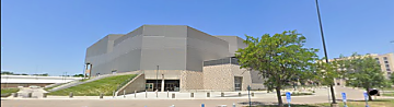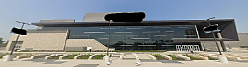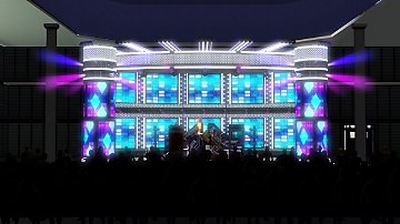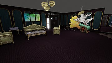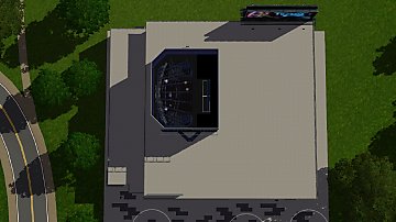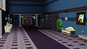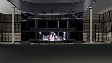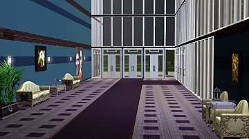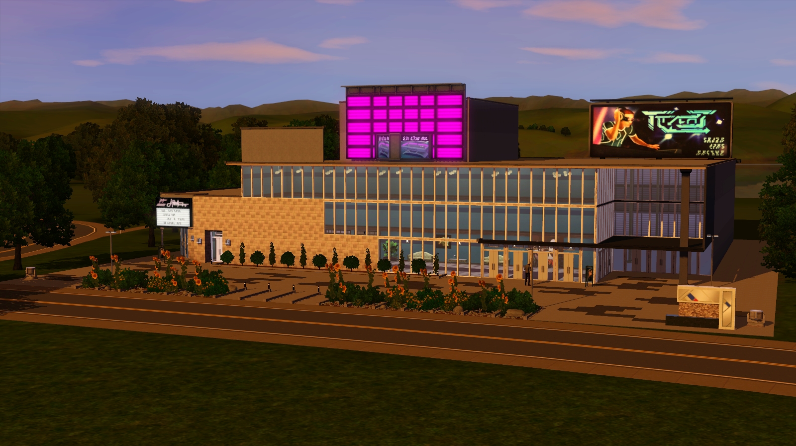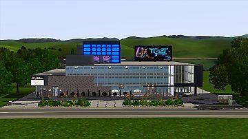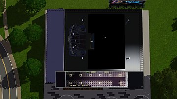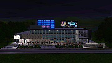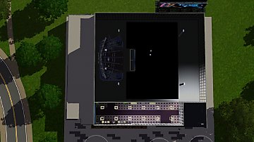 At the front of the lot is a three-story lobby. The third floor of the lobby contains ceiling light fixtures, while the other two floors contain invisible lights so the light "travels" down between levels. Off to the left is a hallway leading to restrooms at the front, and a dressing room at the back. The rest of the lot contains a three-story arena, with an additional two stories above the stage. Every floor except the first contains a level skip marker. A proprietor marker has been placed outside near the front doors to prevent the proprietor from wandering inside, as that renders them both unable to be interacted with, and unrouteable.