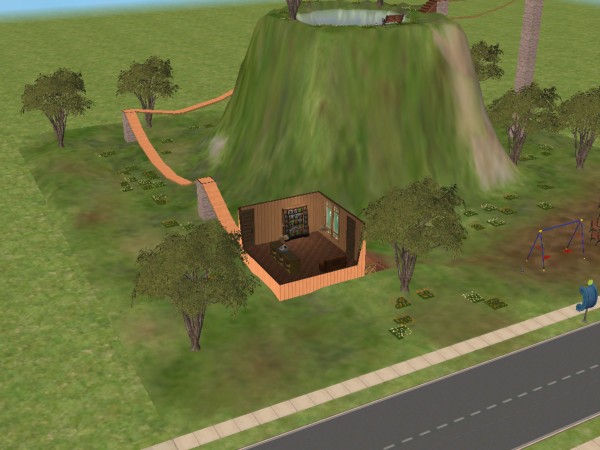 This is the first in the Expedition series of community lots. Your sims are welcome to climb to the top of the volcano using narrow, rickety bridges with no railings, and hope that it won't decide to become active again during their visit. The volcano has long since filled up with water, so it really should be safe. I mean, how could lava come shooting out of the water? That's what I thought.