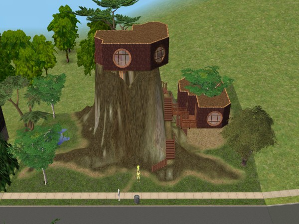 This is my vision of the Wood Elf treehouse theme. There have been a few other lots related to this theme, but I took a different approach. Rather than using walls to replicate the tree trunk, I decided to work with the terrain. I went ahead and got a relatively decent looking tree stump to build on. There are three levels on this lot, but due to the way I built them, the game considers them all the same level.