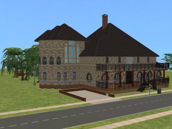 It's a sprawling mansion on a 3x5 lot, with two stories plust a basement. It has 5 bedrooms, two baths, a nursery room, kitchen, dining room, den, living room and a sunroom (or should that be a moonroom, for vampires...). It costs 136,943 simoleans. I packaged it up for posting on MTS2 using only Maxis content, and I checked that it is clean using the Sims2 Pack Clean Installer.