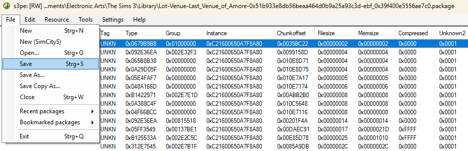 3. Open that file with s3pe. (After opening s3pe, click on "File", then "Open". Then sort through your folders to the above-mentioned Library folder and choose the Lot/Household file you want to open.)