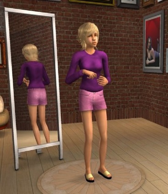 Her name was Cora Leslie. I always give them names, which is probably a mistake, as it then makes me feel bad when I don't save them to my game. Calling a Sim by name makes them sort of "real" to me. She generated in this outfit consisting of two Maxis base game separates, but I think it coordinates well. She generated with Face 18, which I tweaked a bit to make her unique. She has green eyes. Originally she had that awful Maxis hair with the sticking-out ponytails, but I changed it to this custom hair, which I think is a great improvement. She also generated with the Cancer birth-sign, which I tweaked a little to make her a little nicer but not quite so neat. I also changed a couple of her other outfits -- she had generated with the same simphany.com green bikini for both undies and sleepwear. By the time I was finished, I really liked her and wanted to keep her in my game. I reckoned she'd be an asset for any neighbourhood. But I'm now trying to play through my Sims to get my game ready to add the Pets EP. And about the last thing I need is more Sims. I've already got several new Sims in the Family Bin, waiting to get into my game. So I exited to the neighbourhood without saving her. And I feel bad about it! To get her into my game I'd have had to either make her into an adult or give her a parent. At least I've got a picture of her and a description (in this post), so she might still get into my game in some form in the future.