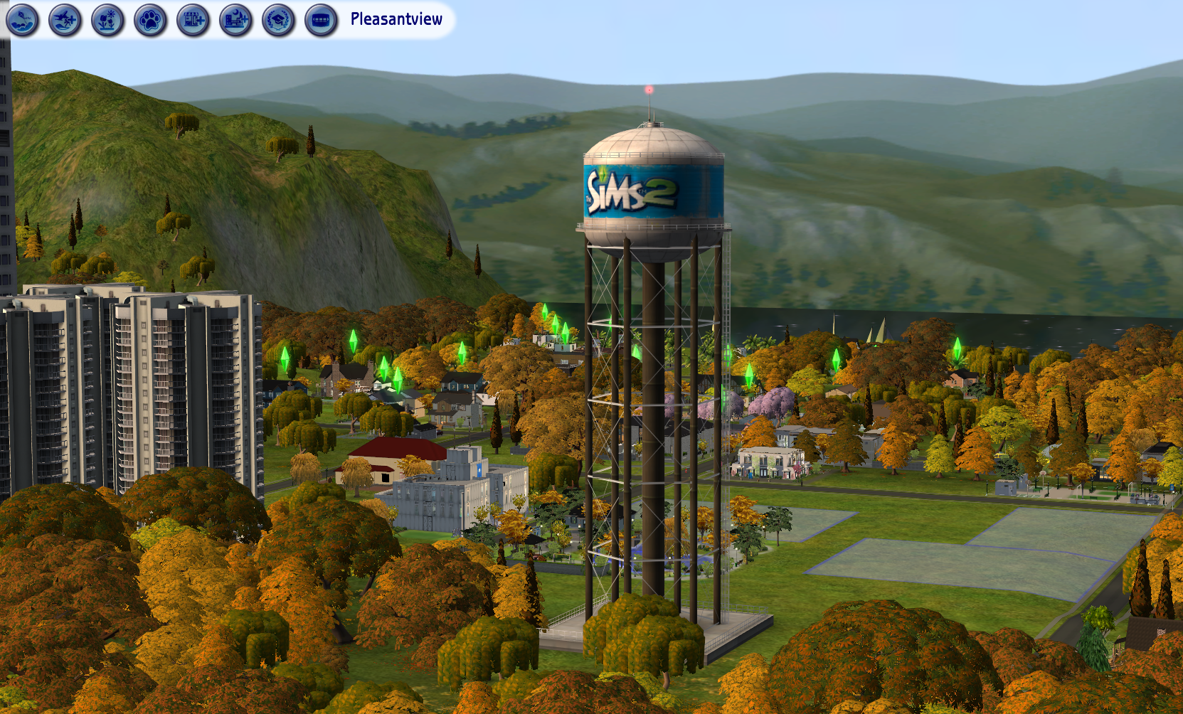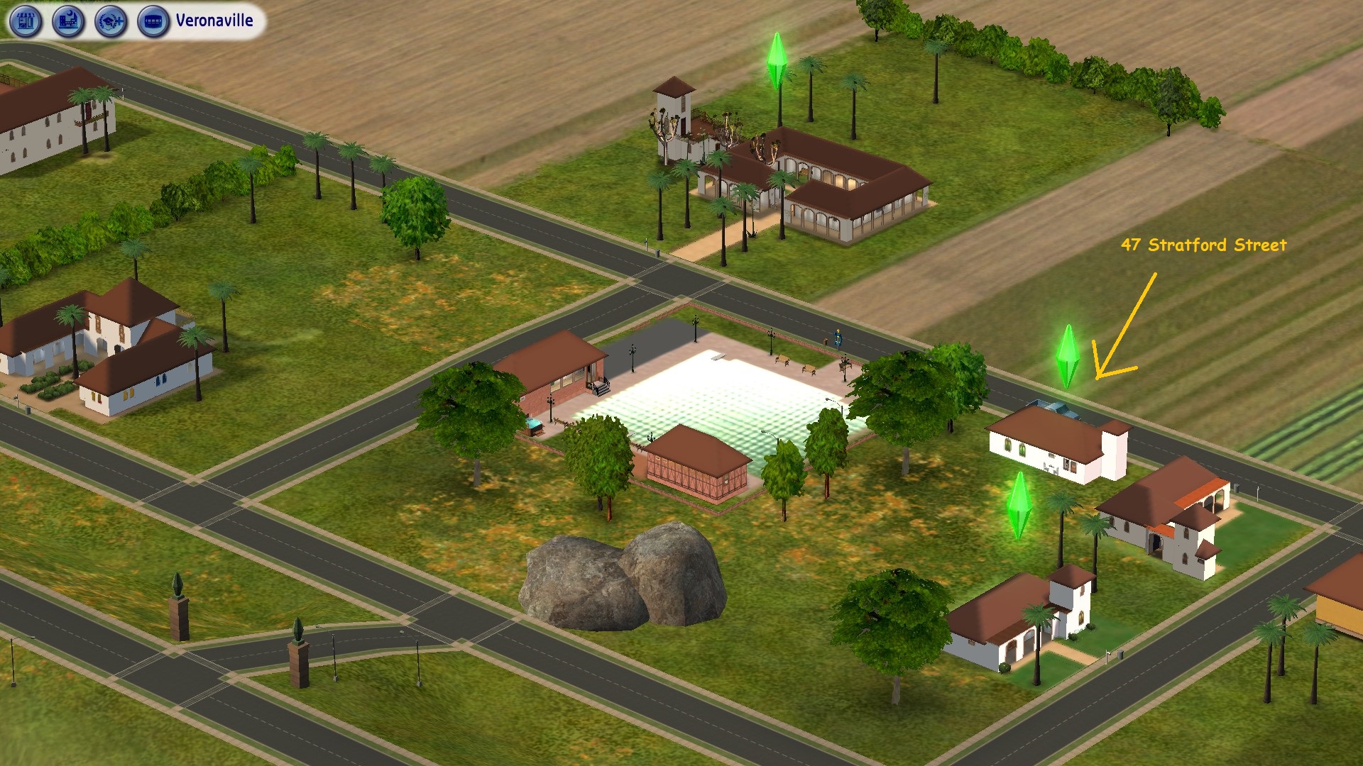 They live in a small commune of gay Romance boys at 47 Stratford Street, next door to the Swim Centre, and quite close to the Monty Ranch on the other side of the road. It's the kind of commune where everybody loves everybody else! The building you can partly see at the top left hand quarter is 111 Stratford Street, where Viola Monty has been living since she returned from Scandinavia to Veronaville. At the height of the Capp/Monty feud, she had been taken as a child to Denmark for her own protection. At the bottom right hand side of the picture you can see the corner of Stratford Strip, with its yellowish "Honey Pot" stucco walls. As it's the nearest Maxis community lot to them, the boys decided to start their tour there.
