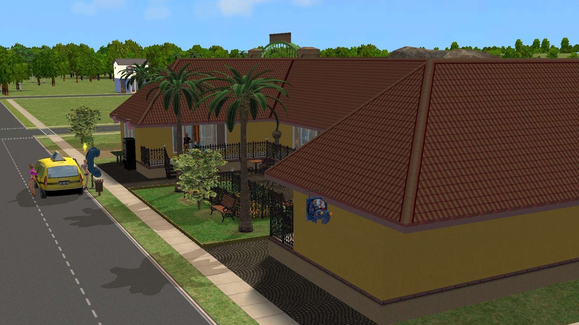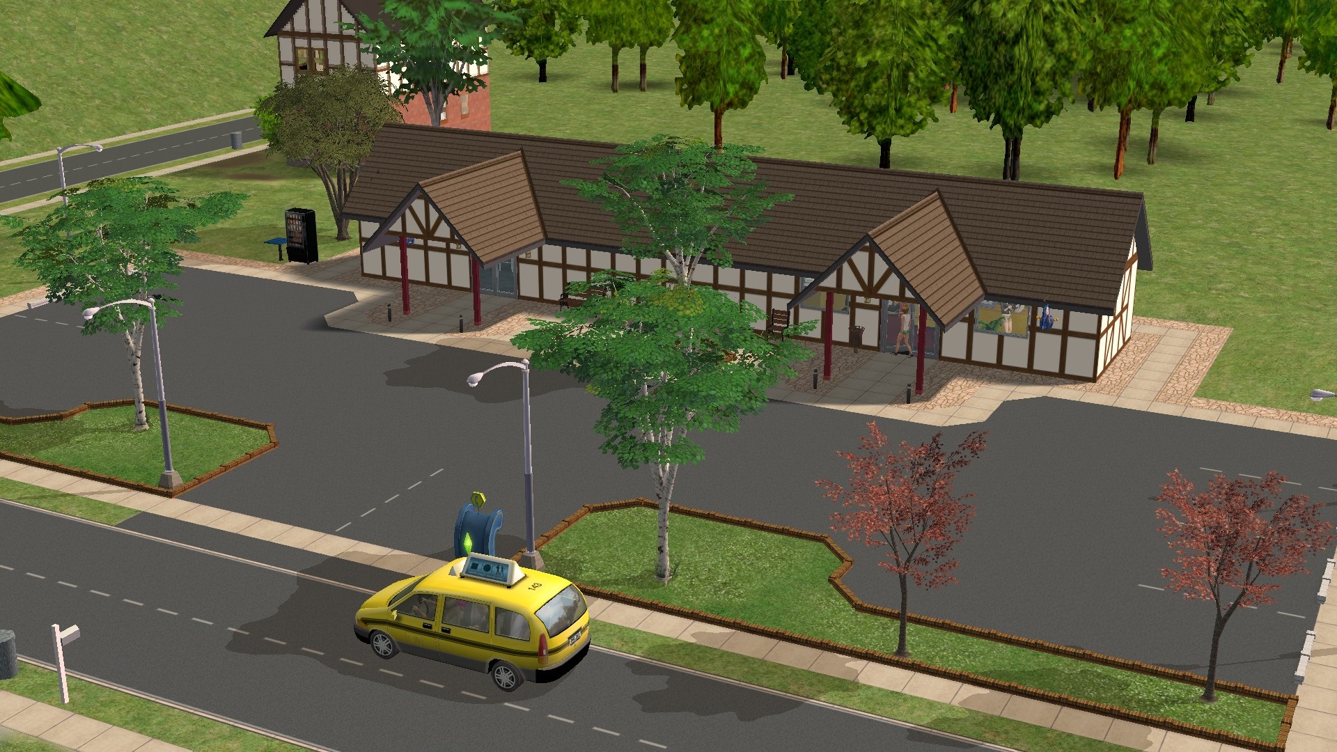 431 Globe Street is the smallest of the Maxis community lots in Veronaville. Although it is built in the traditional Tudor style found throughout Eastside Veronaville, it is clearly a modern building, built to match the style of the old buildings nearby. The right hand end of the building contains a small shop selling magazines and games. Maxis must have expected this shop to get busy, as two tills are provided, meaning that two teenage cashiers appear to work them. The left hand end of the shop contains four pinball machines, though I didn't see anyone playing them during Stanley and Luca's visit. As at 5 Pentameter Parkway, there is no grill here, but again I have added a pacotacoplayer CC vending machine, so visiting playable Sims can still get sustenance. The boys went into the shop; would you like to follow them inside and see what was going on there?