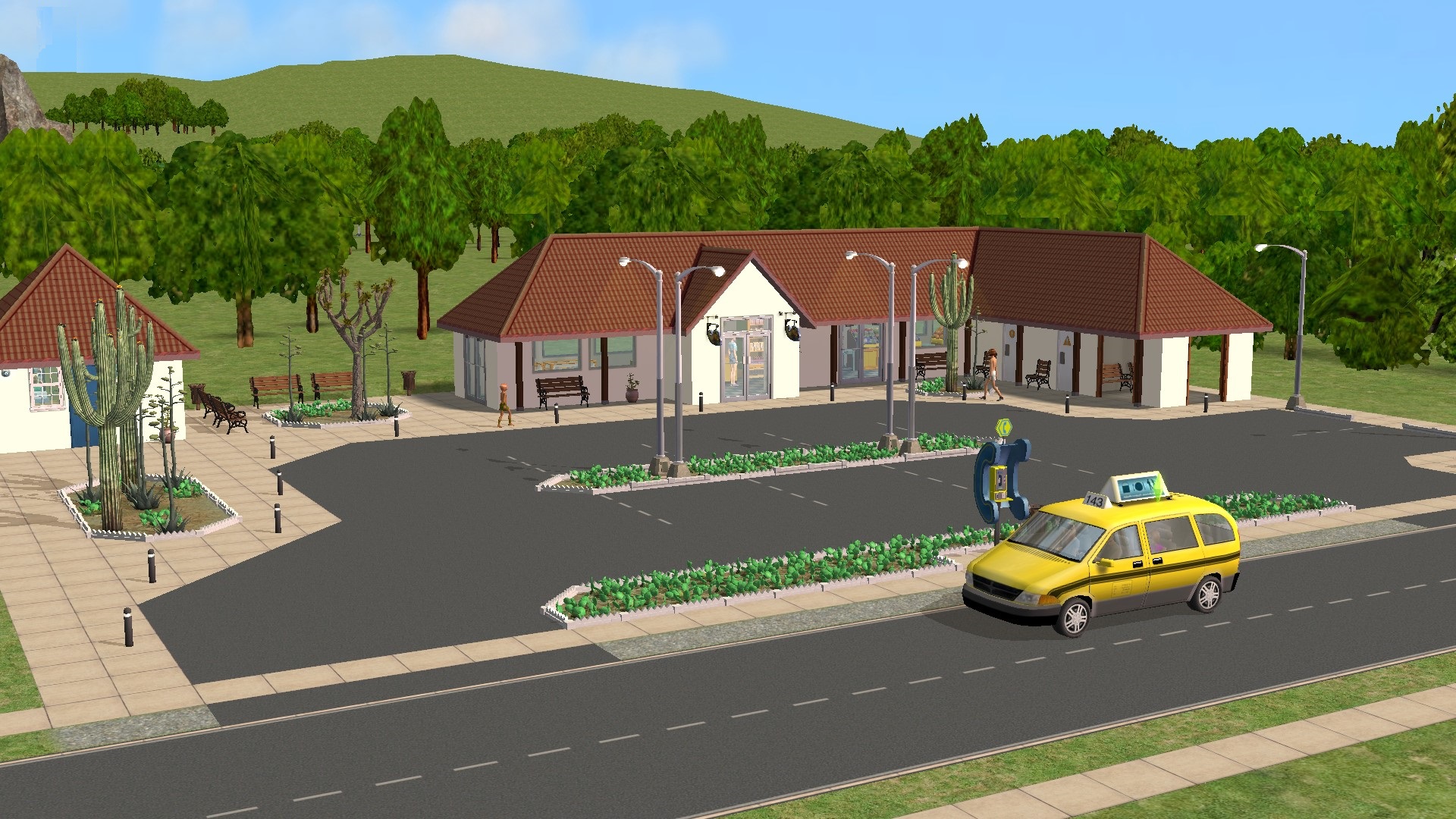 Then they went on to 5 Pentameter Parkway, which has a small supermarket in an almost rural setting. The small kiosk building to the left sells magazines. Perhaps unusually for a Maxis community lot, there is no grill or other cooking facility at 5 Pentameter Parkway. The pactacoplayer vending machine I added inside the kiosk at least in part remedies this lack. I find it interesting to watch the way they all dutifully walk round by the paved paths round these big car parks. If I was there I'd be tempted to walk straight across the tarmac, especially as there are never any cars in the car park. Luca and Stanley stocked up on groceries in the main shop and bought a copy of the Highbrow Review in the kiosk, to satisfy their mutual interest in environmental politics. They then ordered a taxi to take them across the canal to the old Veronaville Market. By the time their taxi arrived it was beginning to get dark.
