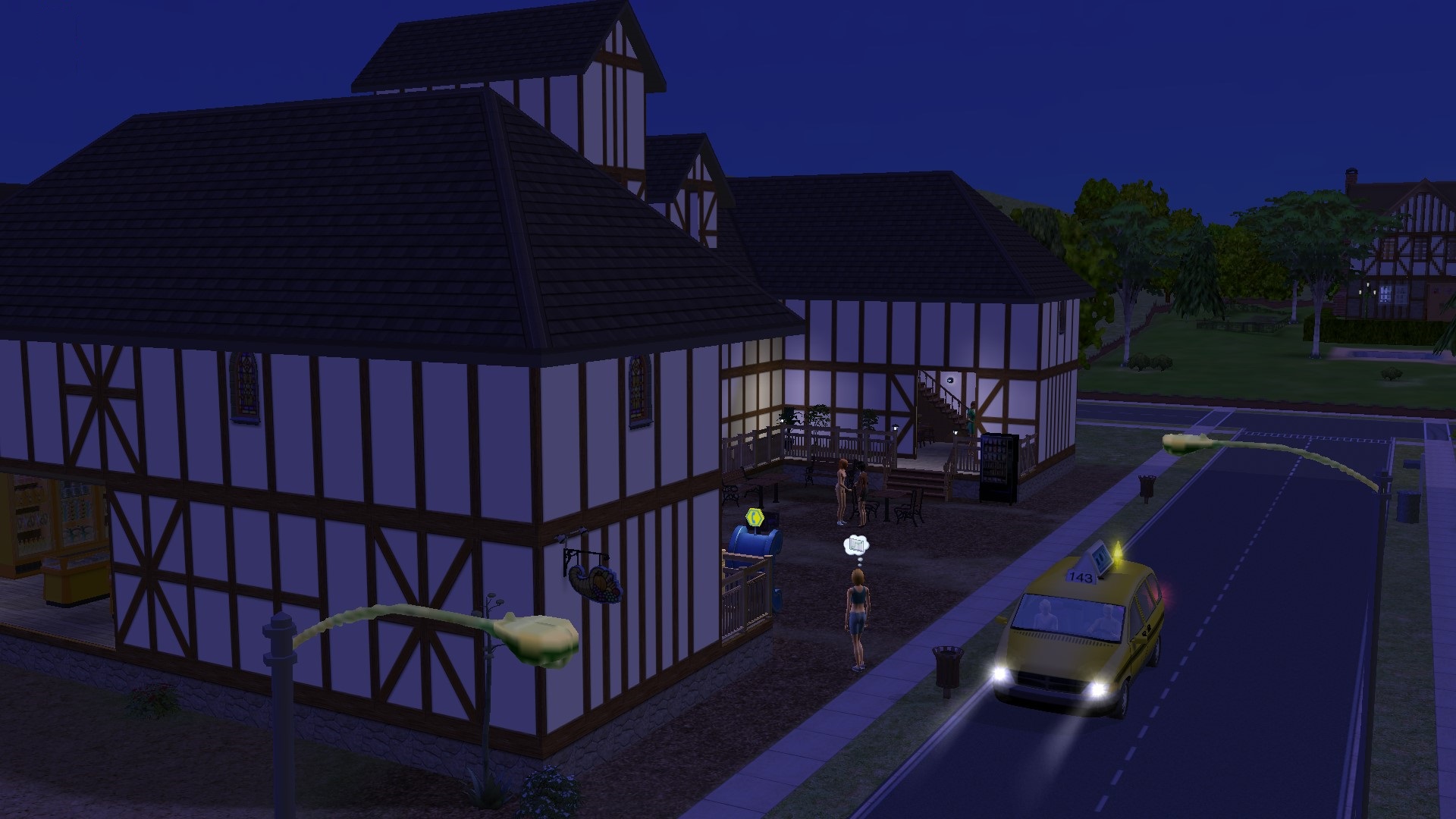 By the time they arrived at Veronaville Market, it was completely dark. This by far my favourite of the Maxis community lots. The others are all relatively modern with their tarmacked car parks, but Veronaville Market just oozes character and history. It clearly dates from the same era as the old half-timbered houses here. Andrew, who lives just across the road, has done some research into the Market for a school history project, tells me that the current building dates from the early seventeenth century (around 1610) the height of Veronaville's prosperity as a "wool town" but there was a medieval market on the site for several hundred years before that. During Veronaville's long decline, the building began to fall into a state of disrepair, and eventually the upper floor, which was originally used to store wool and other agricultural produce, collapsed as a result of an infestation by deathwatch beetle. There was some attempt to restore the building in the latter part on the 19th century, and the current walkway at first floor level was constructed in the 20th century. Clearly there have had to be some adaptations for modern life, but Andrew and I think it's nice to see the old building still functioning for its original purpose -- trade.