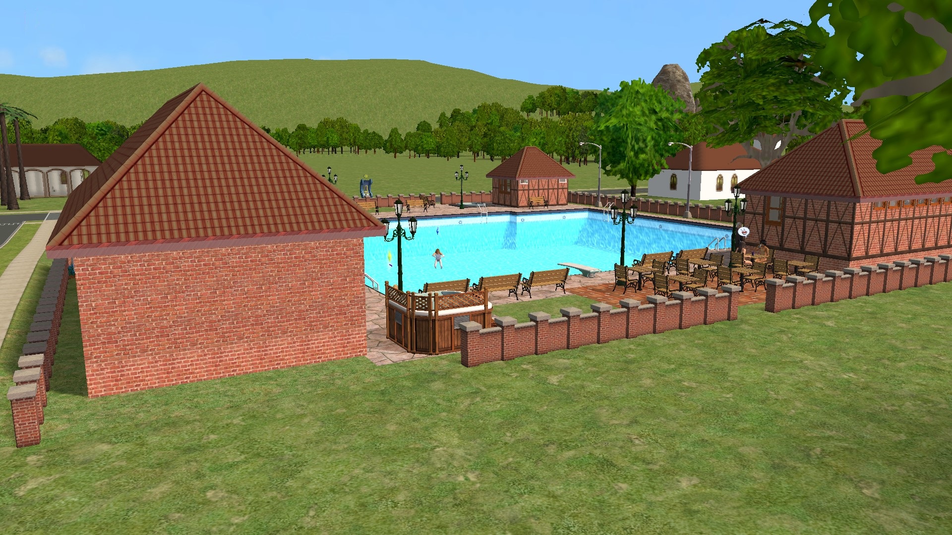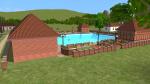 It's not one of the Maxis lots, but I added it within a few days of starting to play (30th November 2012). As first built it, it was really just the swimming pool in a big field. I sent first Garry and then Andrew there when it was still in that state. I had started building the toilet block (the plain brick building on the left) but I didn't know how to finish it. In particular it had no toilets inside and no steps to get in. Of course that's the way it was when I sent Andrew there to lose some weight (the result of his mum feeding him three wholesome meals a day!). Of course, without a working toilet, he got caught short, and he'll never let me forget it! By the end of December 2012 (a month after I started to play) it was more or less in its current state, except that the building on the right (now the restaurant kitchen) was then a do-it-yourself cooking facility. The little building on the far side of the pool, a small kiosk that sells magazines, coffee, and magazines, was added a couple of years later. I have posted some pictures of the Swim Centre before, but this one shows it from the rear. The gaps in the perimeter wall were originally a mistake, as this was about the first piece of building that I did, but I've come to kind of like their sheer idiosyncrasy! The building with the white walls visible between the kiosk and the restaurant kitchen, is 47 Stratford Street, the little new-build Italianate house that Stanley and Luca share with four other gay Romance Sims.